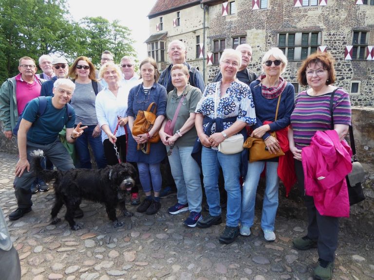 Die traditionelle Frühjahrswanderung der Deutsch-Französischen Gesellschaft (DFG) Recklinghausen hatte diesmal den „Burgenpatt“ in Lüdinghausen zum Ziel. Ausgehend von der Burg Vischering ging es am Sonntag, den 26. Mai 2024 bei sonnigem Wanderwetter auf einem acht Kilometer langen Rundweg durch die parkähnliche Gegend. Auch ein besetztes Storchennest konnte dabei entdeckt werden. Entlang des „Karnickeldamms“ und später des „Philosophenwegs“ führte der Weg schließlich zum Café „Indigo“, wo man sich in gemütlicher Umgebung stärken konnte. Alle Teilnehmer der Wanderung zeigten sich sehr zufrieden mit der gemeinsamen Wanderung durch diesen schönen Teil des Münsterlandes.