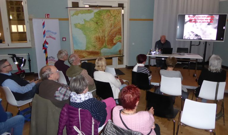 Gerd Lange eröffnete den Abend mit „Je ne chante pas pour passer le temps“ von Jean Ferrat und präsentierte mehr als 20 Chansons in der bewährten Art eines multimedialen Vortrags: Musik für die Ohren, Bilder und Videos für die Augen. Als hilfreich erwiesen sich bei jedem Chanson die kurzen Kommentare zur Einbettung in den historischen Kontext und die jeweilige Problemstellung. Nicht zuletzt die mitlaufende Übersetzung der Texte auf dem großen Bildschirm des digitalen Flipcharts ermöglichte auch Zuhörern ohne französische Sprachkenntnisse ein genaueres Verständnis für die Stoßrichtung der ausgewählten Protestlieder.