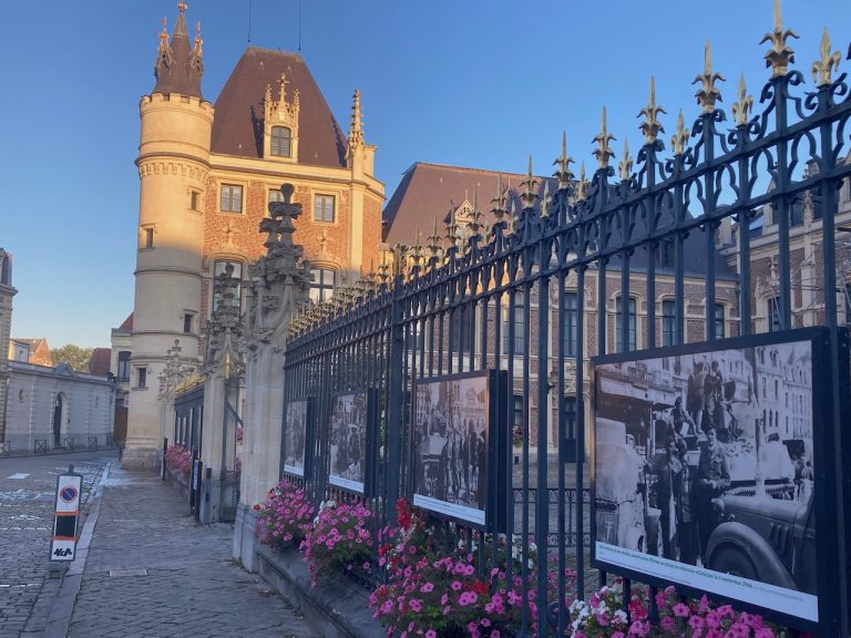 So trat am Samstagmorgen eine deutsch-französische Gruppe zur Stadtbesichtigung an. Unser Stadtführer Michel ließ uns in knapp zwei Stunden unter dem Titel “Les secrets du vieux Douai“ nicht nur unterschiedlichste Fassaden entdecken, sondern öffnete uns auch manche ansonsten verschlossene Tür. Wir durchquerten Gassen und Gässchen, verstanden deren weitere Funktion als Brandmauern zwischen den Wohnquartieren und hörten erstaunliche Geschichten aus der „Stadt der hundert Türme“, wie Douai einst genannt wurde. Es wurde ein Parcours durch die Geschichte der Stadt und die Einflüsse, die sie geprägt haben. Endpunkt schließlich im Hof des Rathauses. Hier war vierzehn Tage zuvor, am 1. September, der 80. Jahrestag der Befreiung von den deutschen Besatzungstruppen am 1. September 1944 feierlich begangen worden. Eine Fotoausstellung mit großformatigen Bildern aus den Tagen der Befreiung war dort noch anzuschauen.