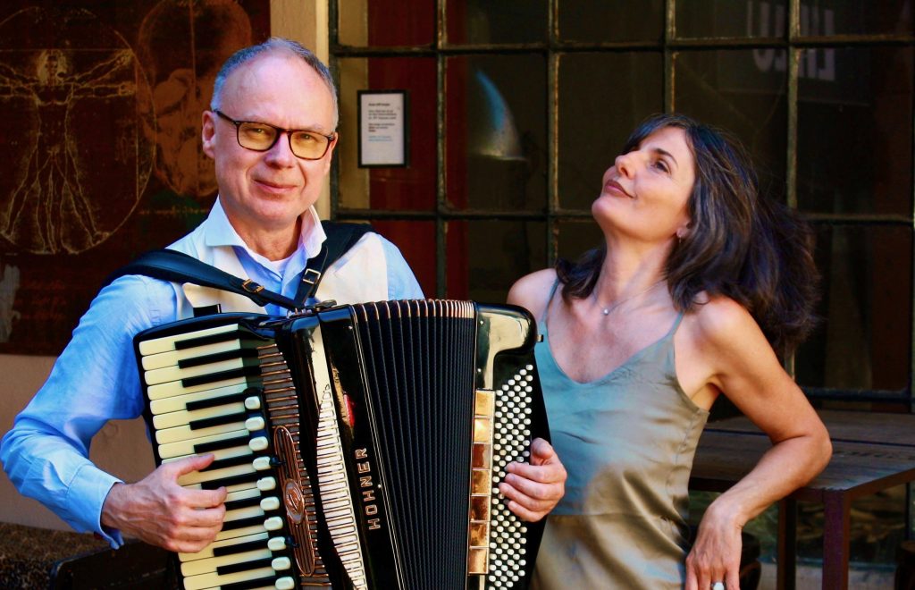 Zu Recht war das konzertante Setting gefordert, denn das eingespielte Duo füllte trefflich den akustischen Raum und entführte das Publikum in die Klangwelt des französischen Chansons, wie etwa mit dem Titel „Les moulins de mon cœur“ und wieder zurück an den Rhein mit der bekannten Vertonung von Heinrich Heines Dichtung „Ich weiß nicht, was soll es bedeuten“. Des Weiteren – als Hommage an das mitgeführte Instrument – eine Soloeinlage des Akkordeonisten von Tango-Rhythmen à la Piazzolla.