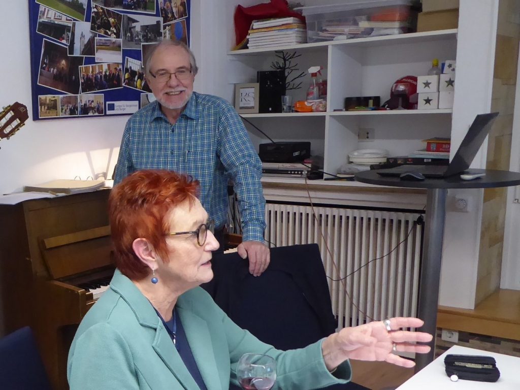 Die sangesfreudigen Mitglieder der DFG fanden sich am 21. Februar 2024 in der BRÜCKE ein, um mit Muguette und Rainer einen Chansonabend zu performen. Ein Leichtes ist es, bei einem Live-Konzert den Refrain des Lieblingssongs mitzusingen, wahre Fans kennen auch den ganzen Text und schmettern von Beginn an mit. Etwas anderes ist es, allein in Begleitung eines Klaviers anzustimmen. Und gar erfolgreich durchzusingen über eine Reihe von Strophen hinweg, ist da schon anspruchsvoller. Aber schließlich hatte sich dieses Format unter der Leitung von Muguette und Rainer bereits mehrfach bewährt und was nun leicht von den Lippen ging, gelang, weil es gut vorbereitet war. Texte und Noten lagen vor, die Auswahl stimmte und es gab instrumentelle Verstärkung durch Claudia an der Gitarre.